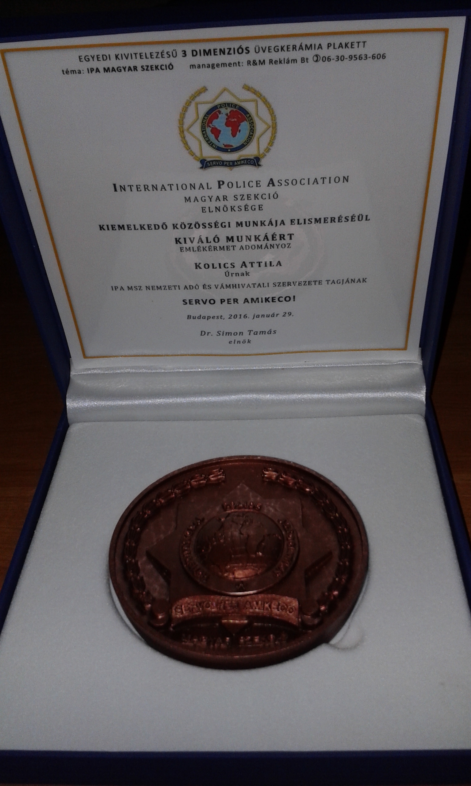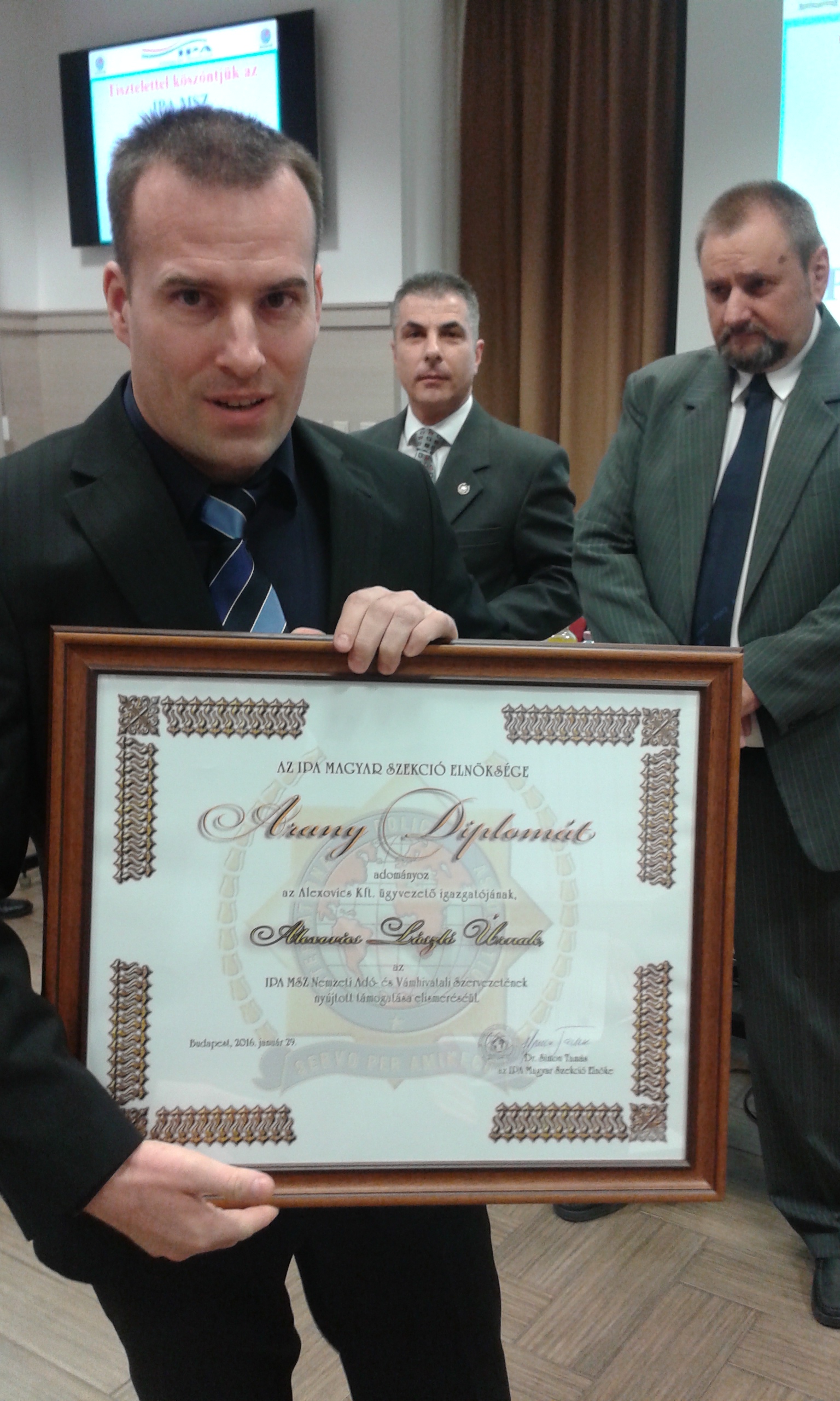 Az IPA Magyar Szekciójának 2016 január 30-i küldöttgyűlésén az Elnökség Arany Diplomát adományozott Alexovics László úrnak, az Alexovics Kft. ügyvezető igazgatójának tagszervezetünk részére nyújtott támogatása elismeréséül,