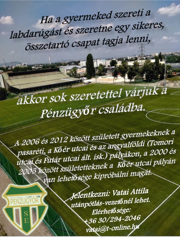 A Pénzügyőr SE labdarúgó utánpótlás szakosztálya szeretettel várja a 2000 és 2012 között született gyermekeket. További információ a plakáton és a www.u14.hu oldalon található.